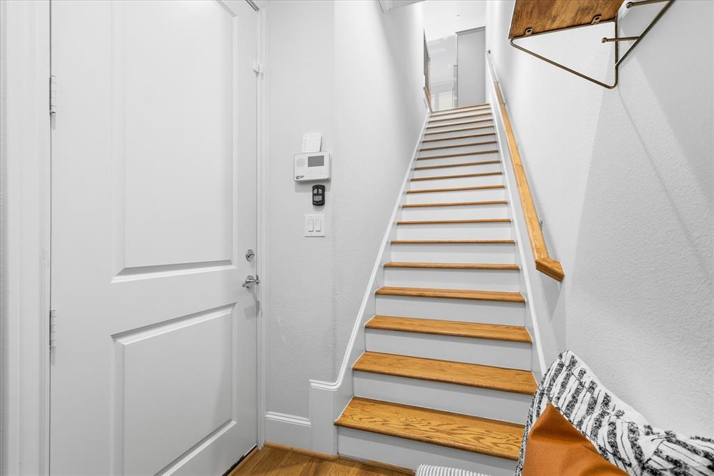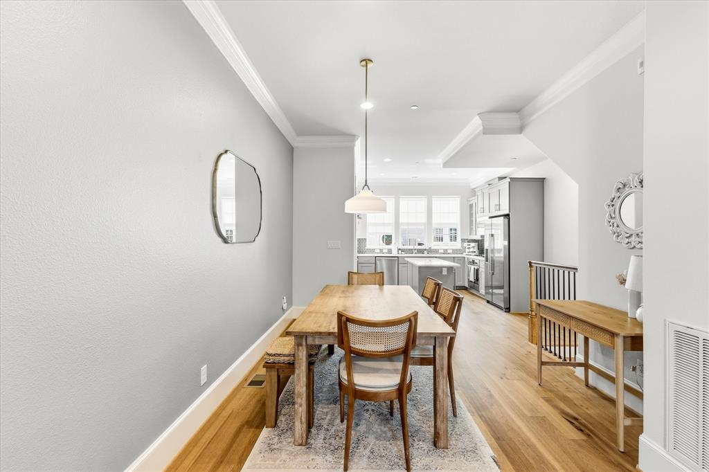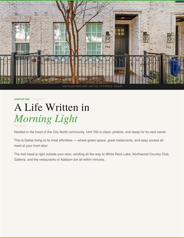 Modern 3-level brick townhome in a prime Dallas location with direct access to White Rock Creek Trail and White Rock Lake—no car required. This 2-bedroom, 2.1-bath home offers 1,350 sq ft of stylish living with hardwood floors throughout, a primary suite with board-and-batten accent wall and crown molding, and a beautifully appointed Bosch kitchen featuring quartz counters, gas cooktop, full appliance suite, and subway tile backsplash. Built in 2019, this home also includes a dual heat pump HVAC system and tankless water heater for ultra-low utility costs. Enjoy the convenience of an attached 2-car tandem garage with direct entry, plus HOA-covered cable, internet, water, trash, recycling, and landscaping. A rare combination of modern efficiency, low-maintenance living, and unbeatable trail access.